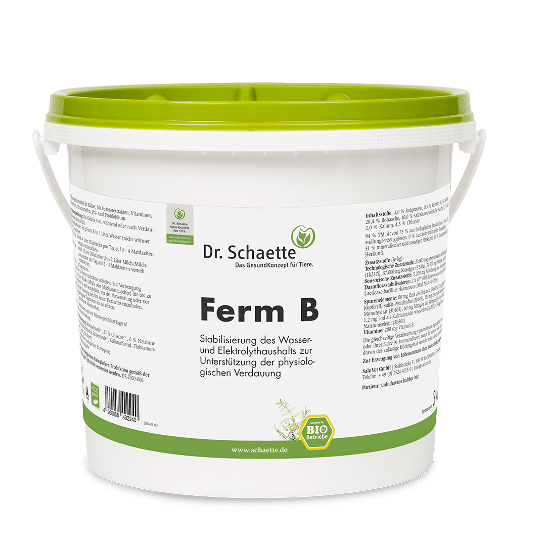 Ferm B ist ein Diät-Ergänzungsfuttermittel zur Stabilisierung des Wasser- und Elektrolythaushaltes zur Unterstützung der physiologischen Verdauung durchfallerkrankter Kälber. Außerdem wird die Darmflora und das Immunsystem durch natürliche Zusätze gezielt stabilisiert. Das gut lösliche Pulver wird in Wasser eingerührt und als Diättränke alleine bzw. in Kombination mit Milch / Milchaustauscher vertränkt. Um die Regeneration zu fördern kann Ferm B als Zwischentränke angeboten werden. Die Rezeptur ist so gestaltet, dass das Präparat der EU-Ökoverordnung entspricht und im Biobetrieb eingesetzt werden darf!
