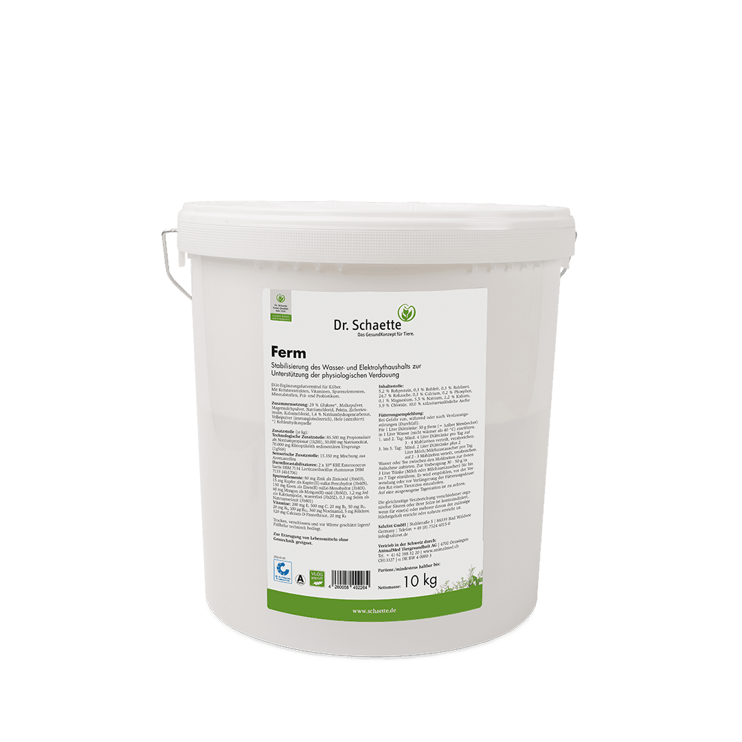 Ferm ist ein Diät-Ergänzungsfuttermittel zur Stabilisierung des Elektrolythaushaltes durchfallerkrankter Kälber. Das gut lösliche Pulver wird in Wasser eingerührt und als Diättränke alleine bzw. in Kombination mit Milch / Milchaustauscher vertränkt. Um die Regeneration zu fördern kann Ferm als Zwischentränke angeboten werden.