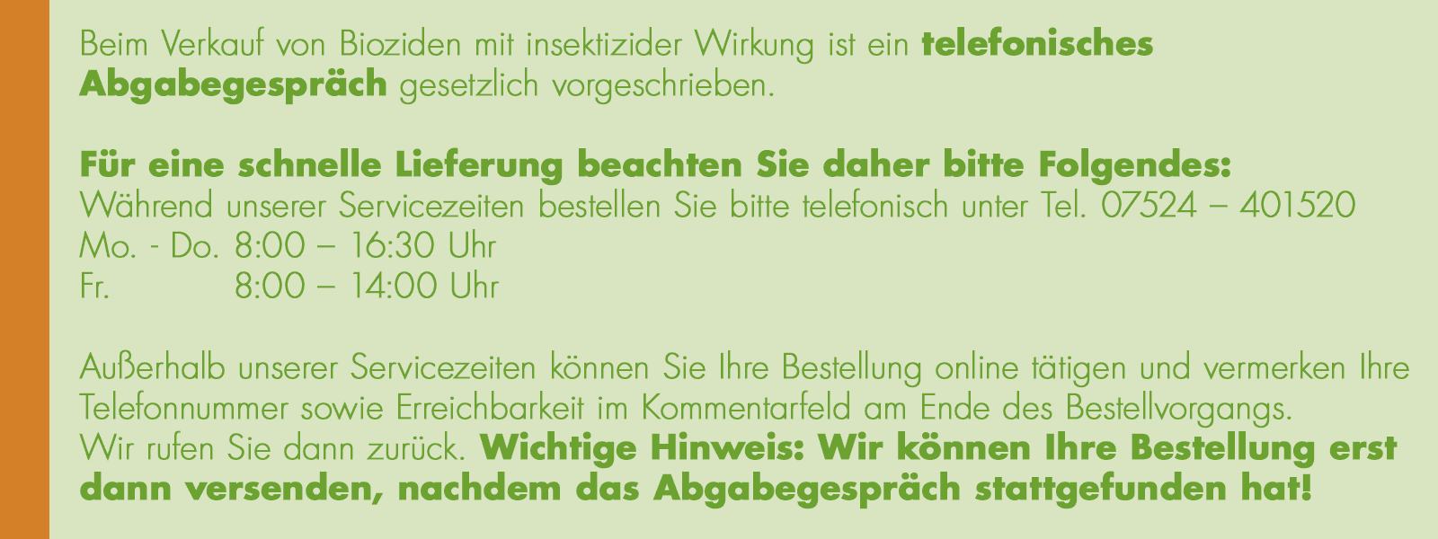 *Beim Verkauf von Bioziden mit insektizider Wirkung ist ein telefonisches Abgabegespräch gesetzlich (ChemBiozidVO) vorgeschrieben.